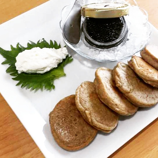 キャビアだけを食べるのではなく、定番の組み合わせ、そば粉で焼くブリニとサワークリームを添えてみたいですね。