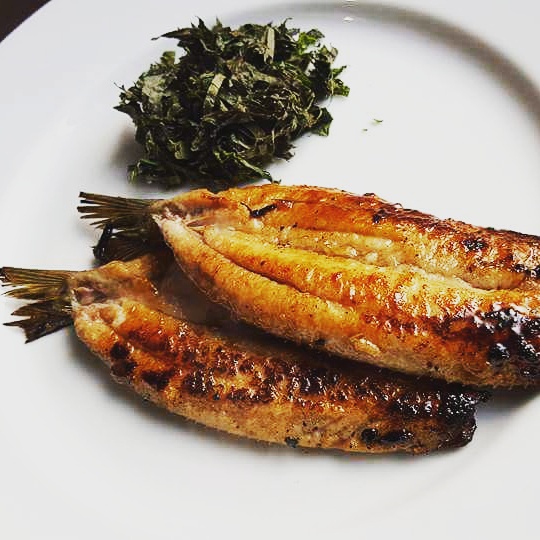 開いて中骨をとったイワシに小麦粉をはたいて、かりっと焼きます。