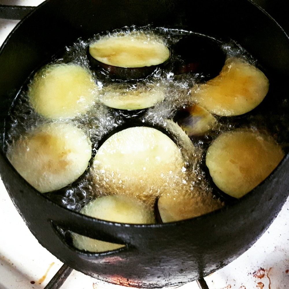 茄子は表面が色づいて、箸で挟むと柔らかく潰せるくらいまでしっかりと揚げます。