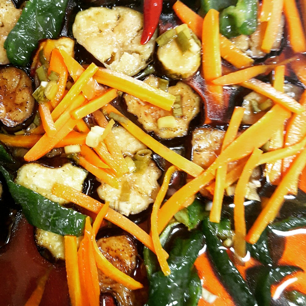 今回はニンジンとピーマンも素揚げにして、彩りを添えました。