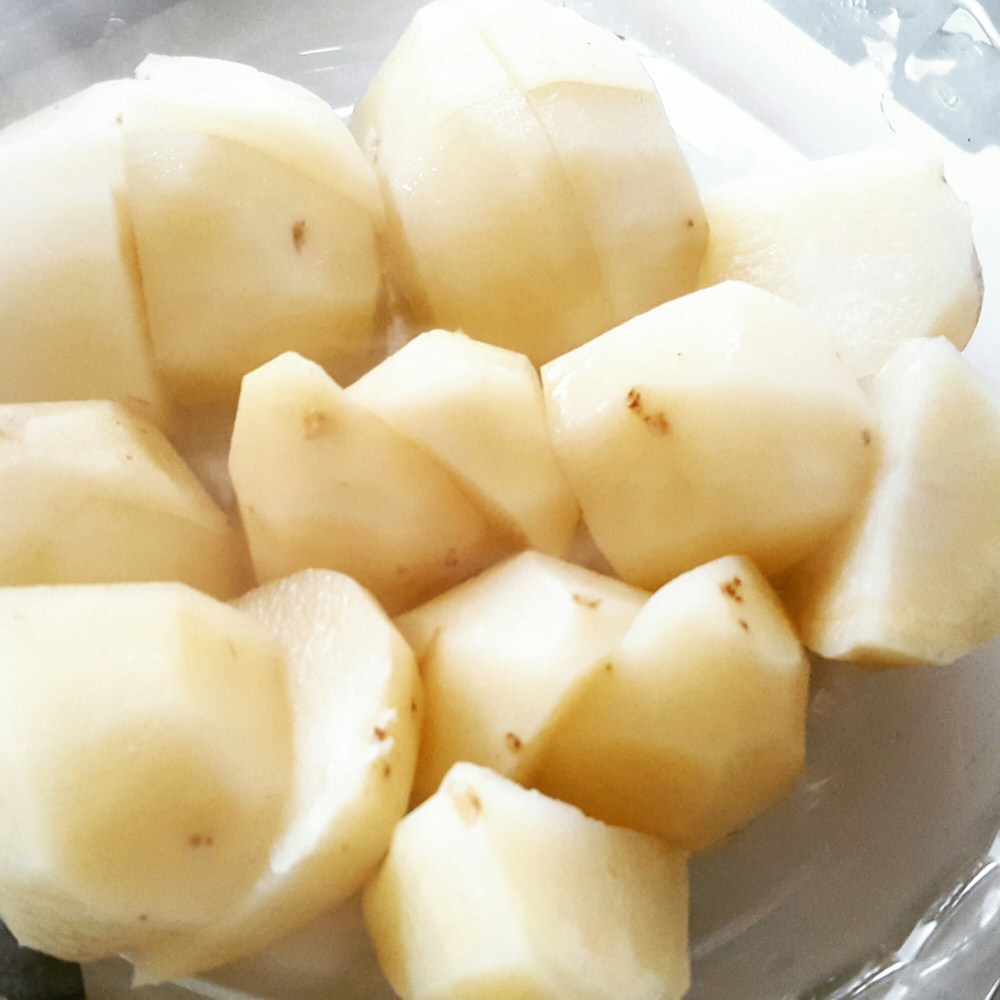 味付けをしたらチンしたジャガイモをを入れて、蓋をしたまま弱火でことこと煮込みます。