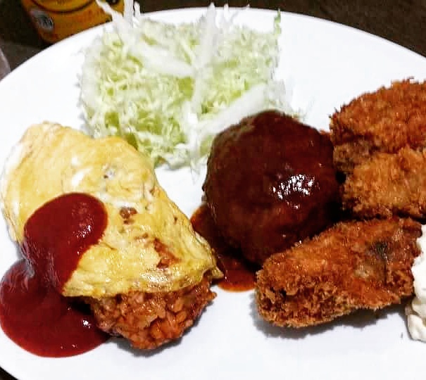 写真はカキフライ、ハンバーグ、オムライスの盛り合わせです。