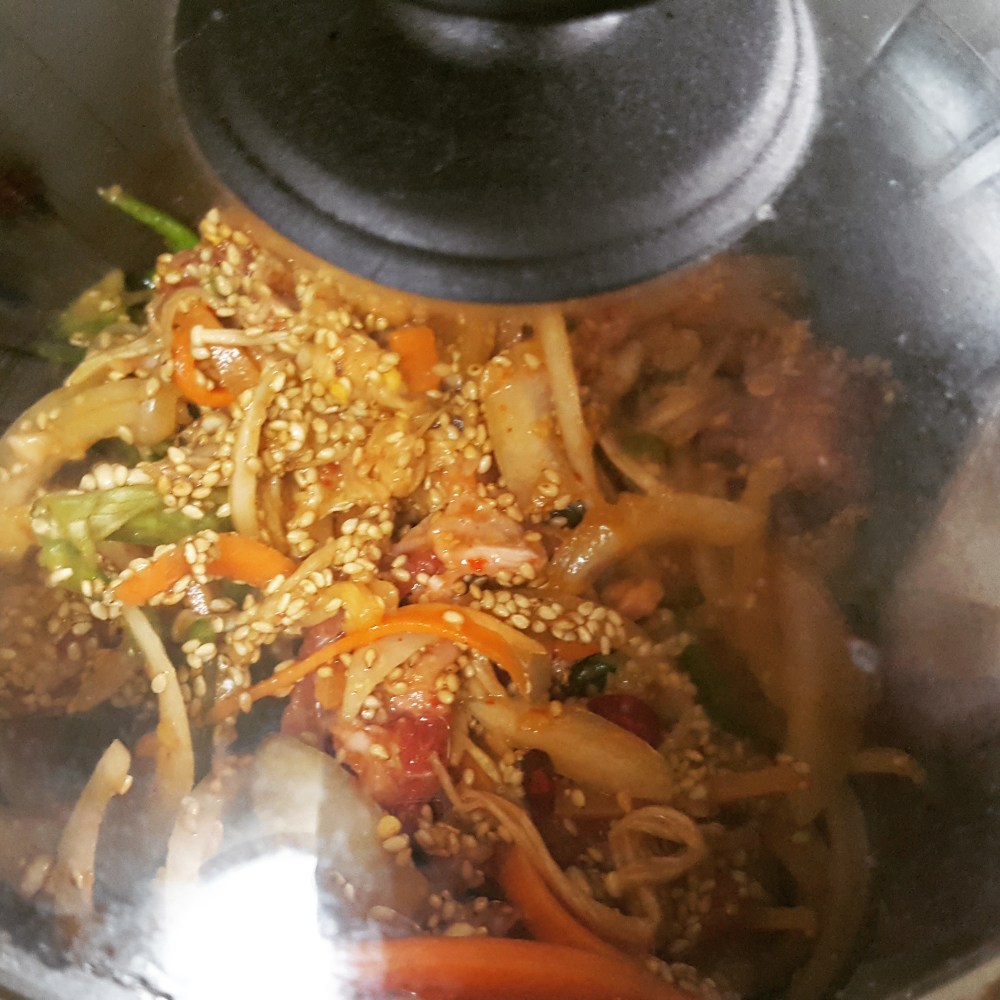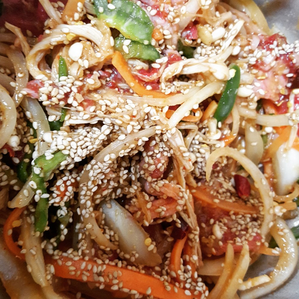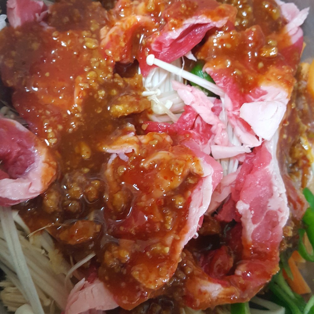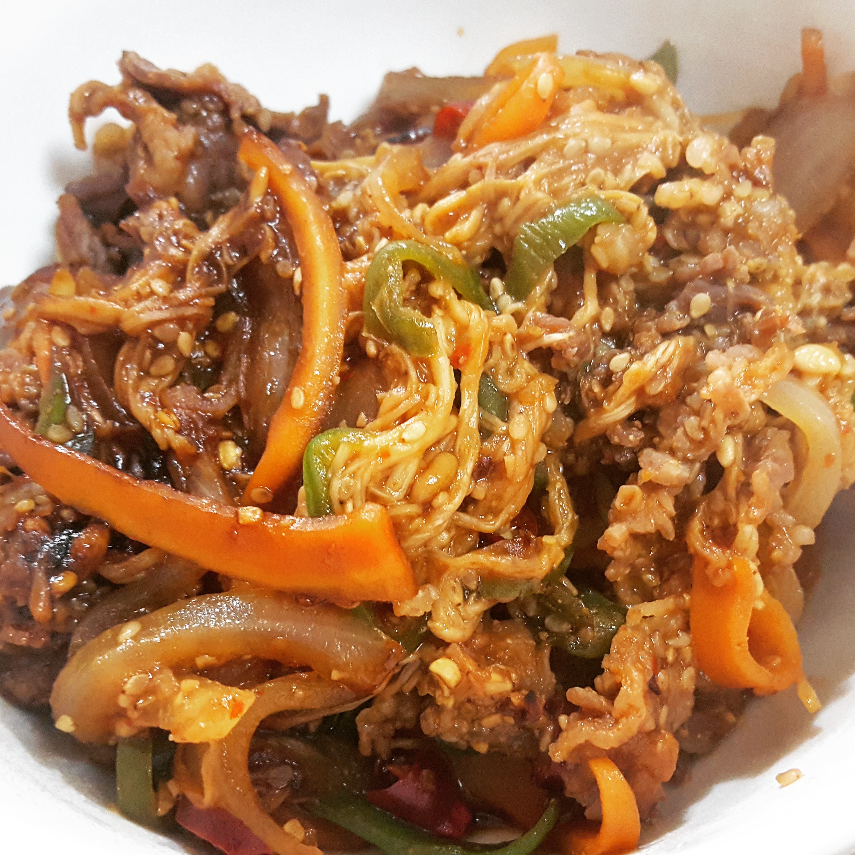 ◆分量(2人分) 牛肉……100グラム程度 玉ねぎ……1/2個 人参……1/2本 ピーマン……2個 えのき……1/2パック にんにく……1かけ しょうが……1かけ 鷹の爪……1本 粒ゴマ……大匙1杯分 【下味用調味料】 醤油……小匙1 味噌……大匙1 みりん……大匙1 コチュジャン……小匙1 酒……大匙2