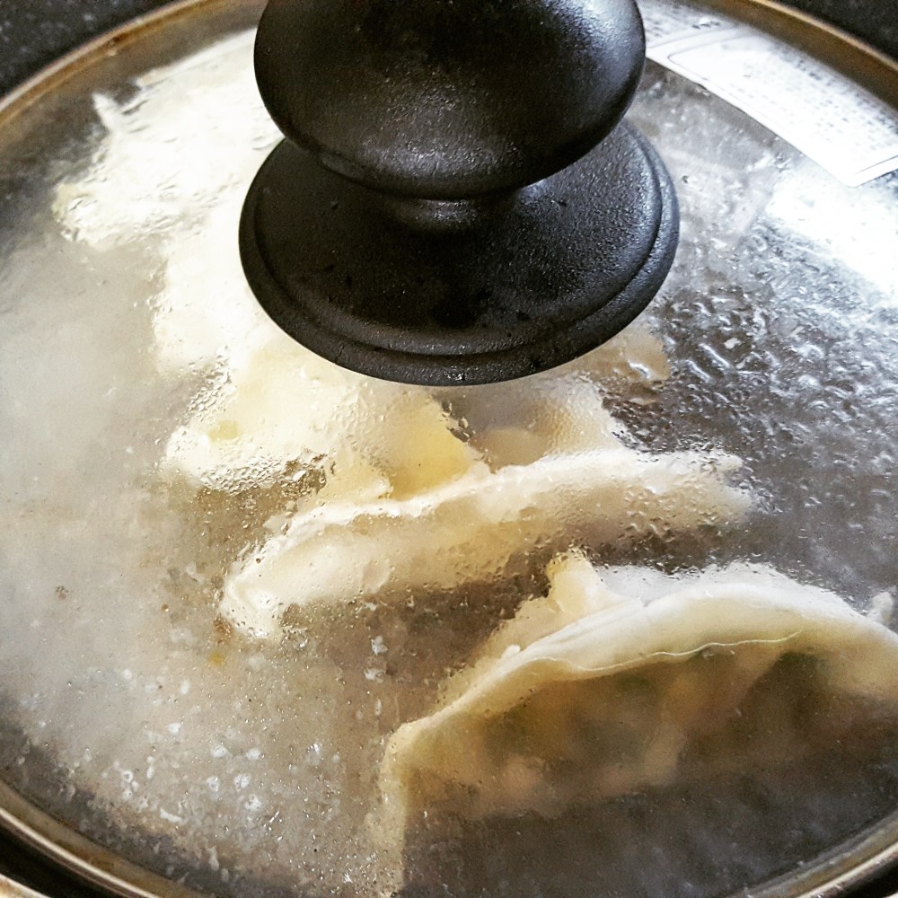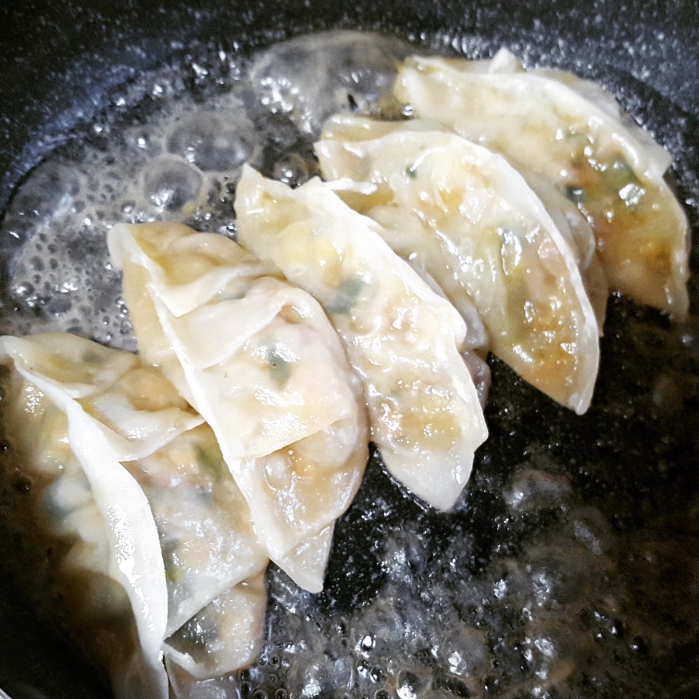 4. サラダ油を敷いたフライパンに餃子を並べてから火をつけ、強火でそこに焼き色がついたら中火に落として水を入れ、蓋をして蒸し焼きにする。