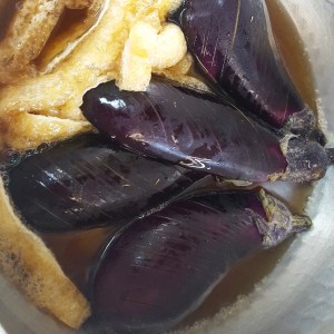 2. 油揚げは細切りにしてからさっと湯通しして油抜きし、なす、星印の調味料と一緒に鍋に入れて火にかける。