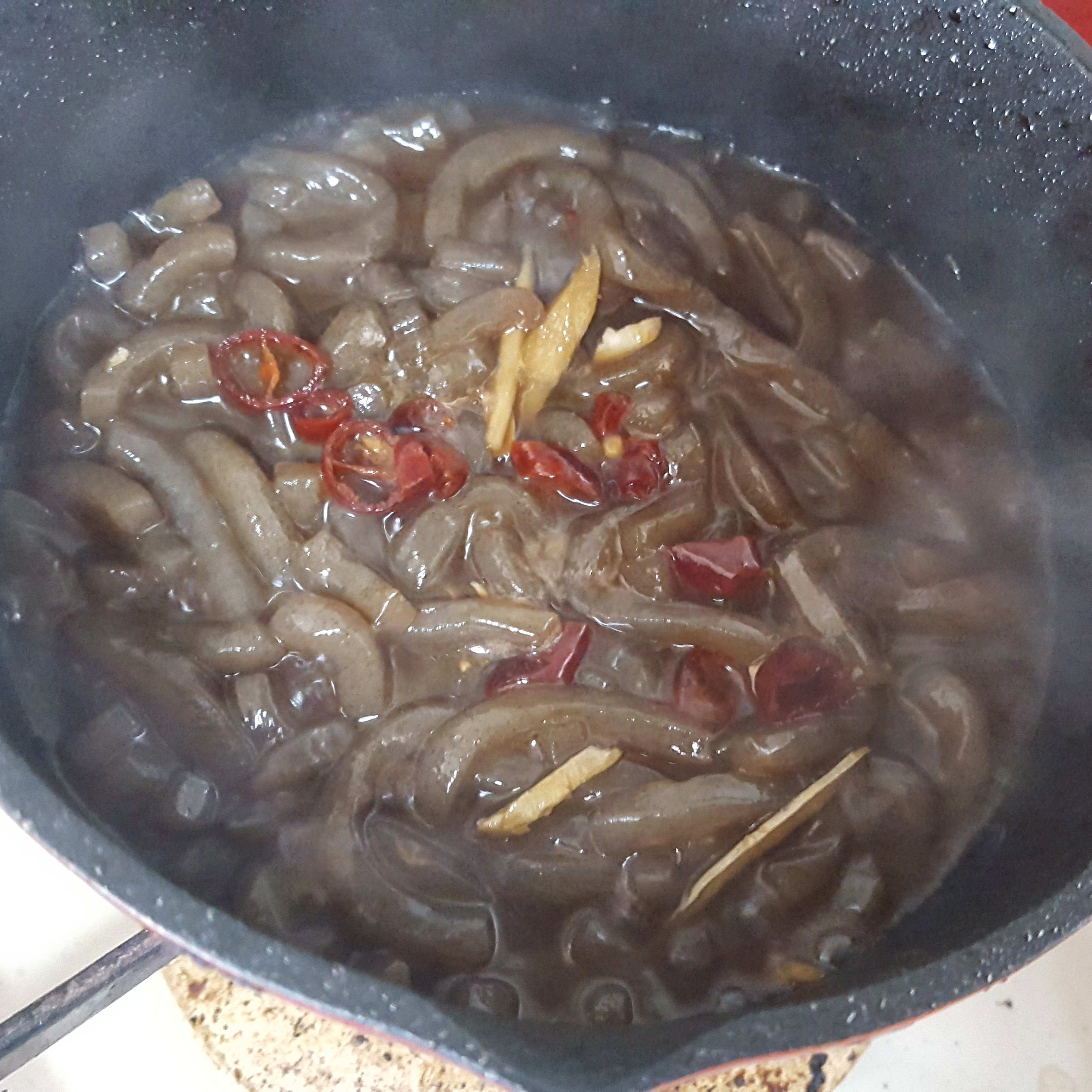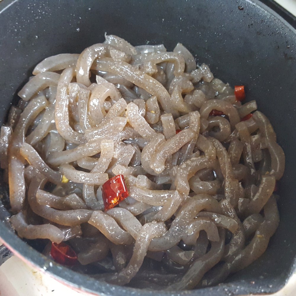 2. 小口切りにした鷹の爪をごま油で炒め、香りが出てきたらこんにゃくを加える。