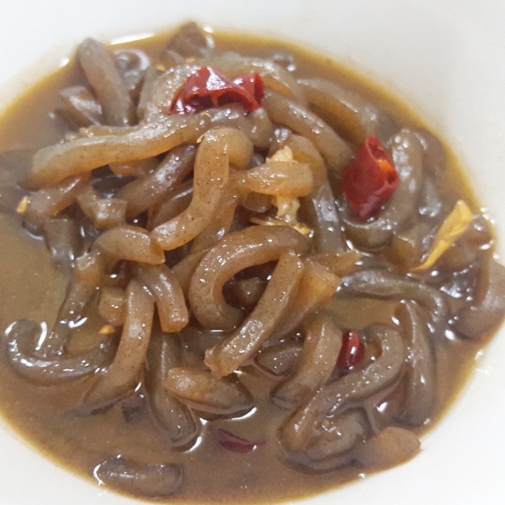 材料(2人前) ・突きこんにゃく……1袋 ・ごま油……大匙1 ・鷹の爪……1本 ・牛肉のしぐれ煮の煮汁……2カップ程度