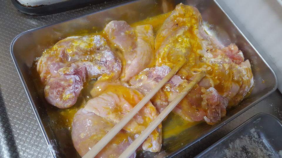 粉をはたいた鶏肉に、卵を絡めて。