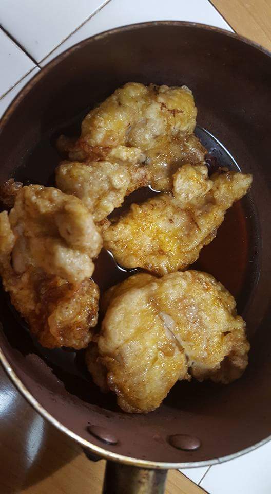 揚げたら甘酢醤油をくぐらせます。