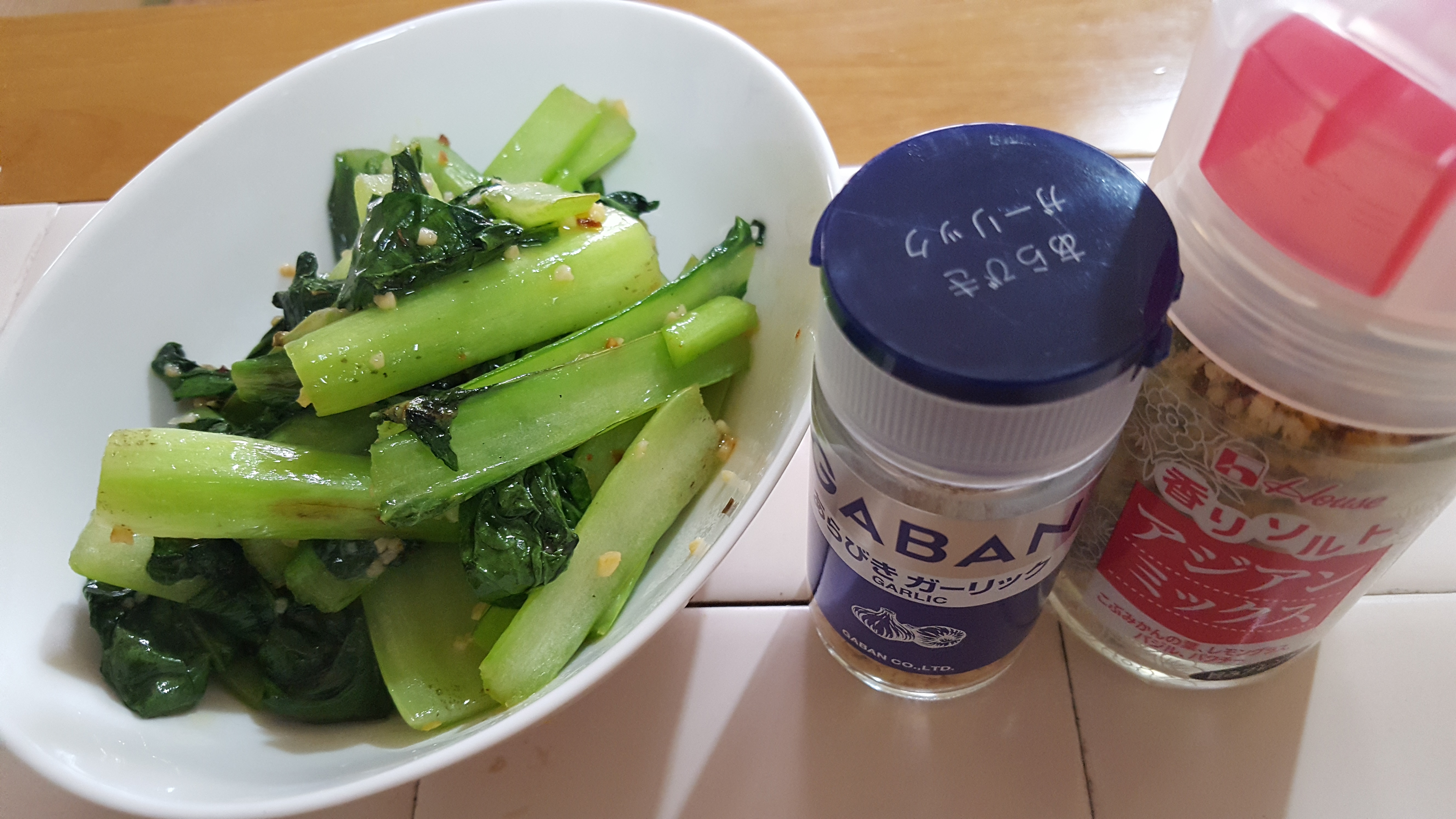 材料(二人前) 小松菜……2束 オリーブオイル……大匙1 香りソルトアジアンミックス……小匙2 GABANあらびきガーリック……小匙1 白ワイン……小匙1