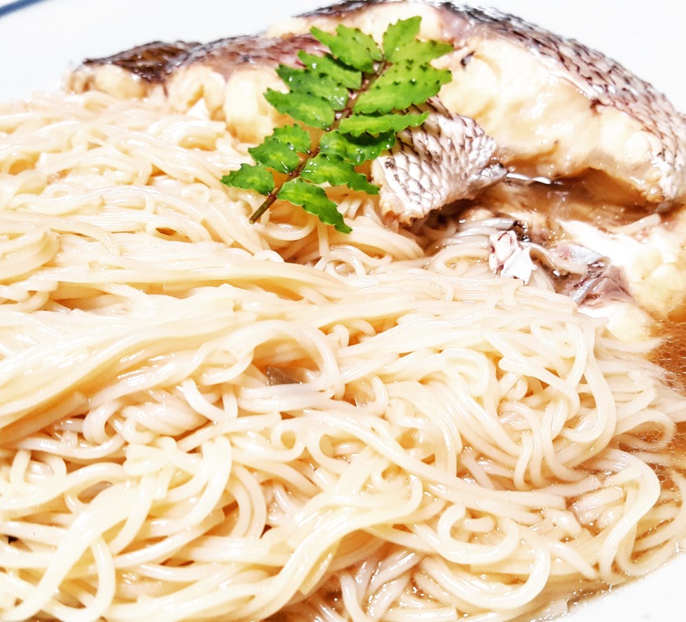 鯛の煮付けの煮汁をたっぷり吸い込んだ、付け合わせの素麺がおいしい家庭料理です。