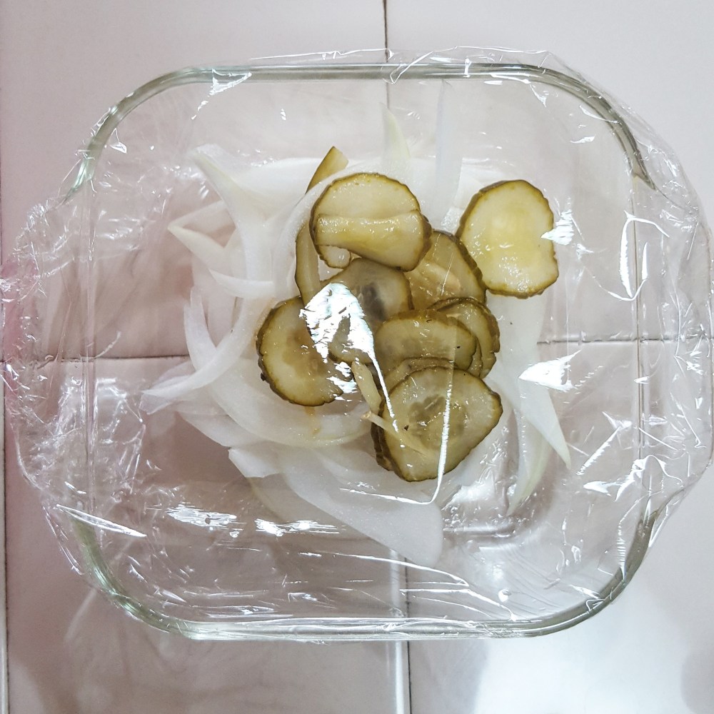 耐熱容器にスライスした玉ねぎとピクルスを入れて、ラップをかけ、レンジで1分加熱します。