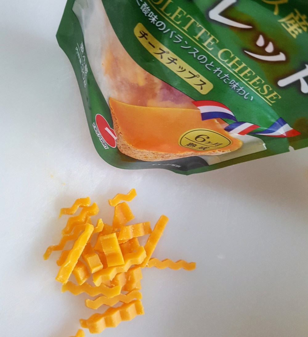 材料(2人前) じゃがいも(小)……5~6個 玉ねぎ……1/4個 きゅうりのピクルス……10切程度 チーズチップス“ミモレット”……5~6枚 酢……大匙1 マヨネーズ……大匙3 塩コショウ……ひとつまみ