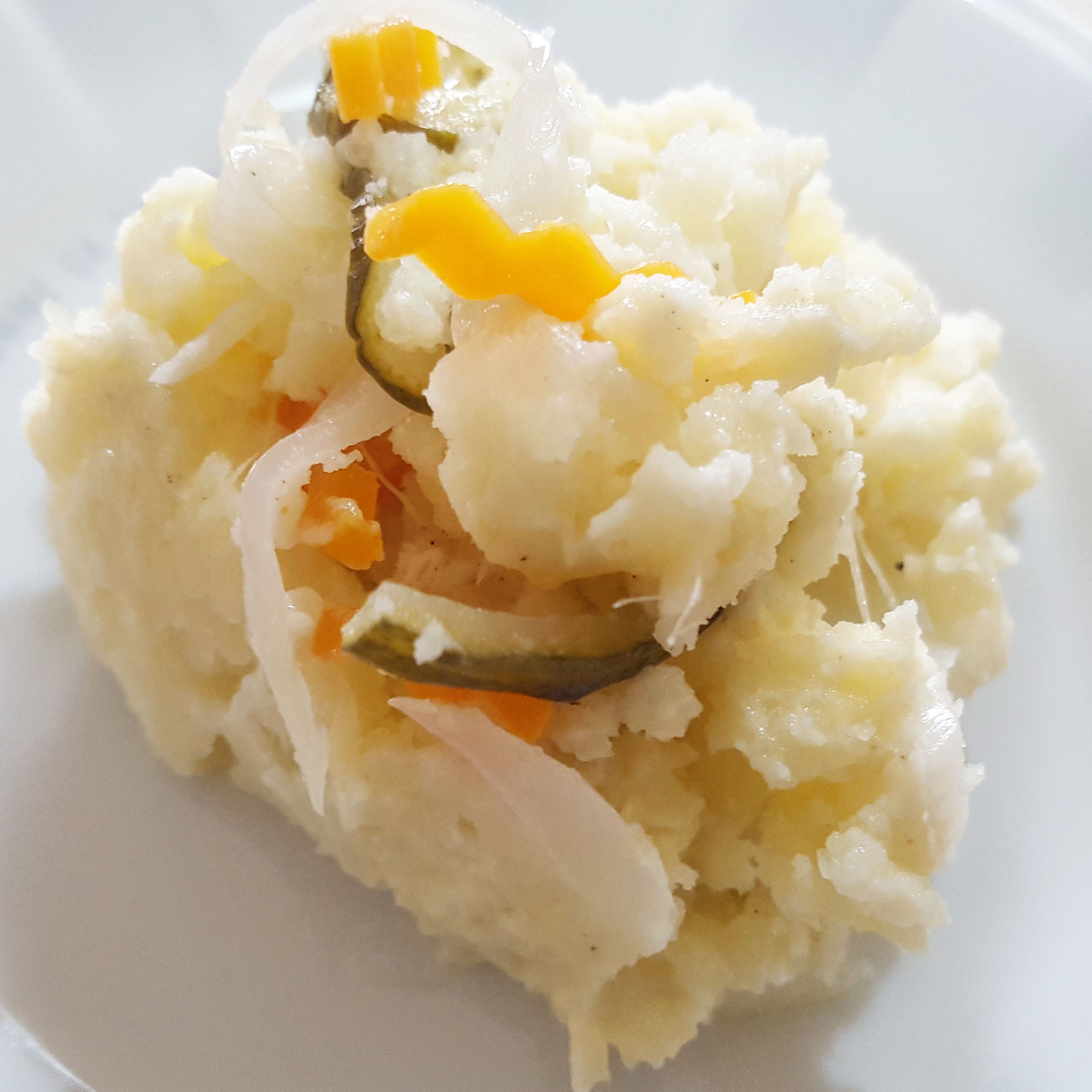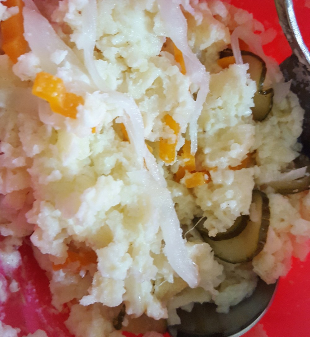 つぶしたじゃがいもに、玉ねぎ、ピクルス、チーズをまぜ、塩こしょうで味を調えます。