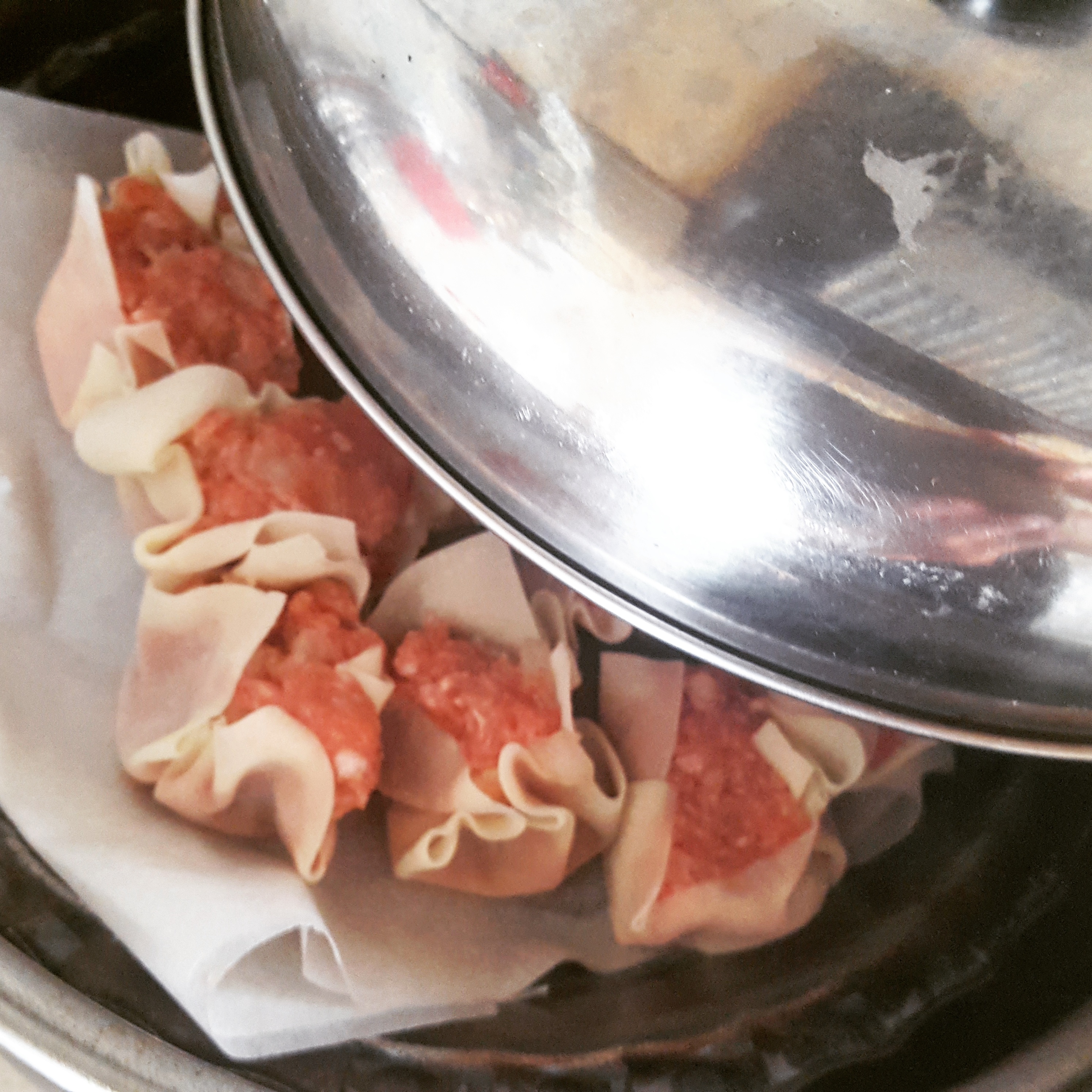 その上にしゅうまいを並べた耐熱皿を置いて、蓋をしてあとは蒸すだけ。