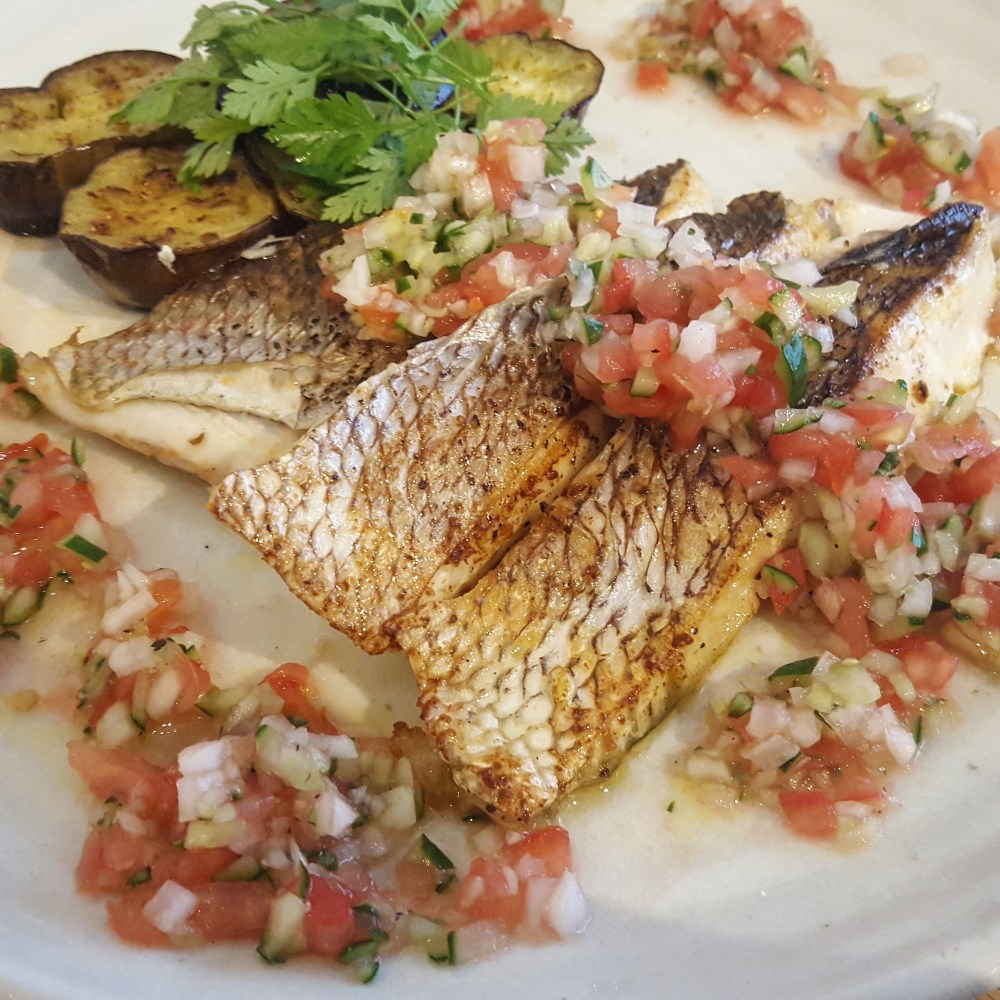 トマト、きゅうり、玉ねぎを使った爽やかなソースをシンプルに焼いた魚に添えて🍅