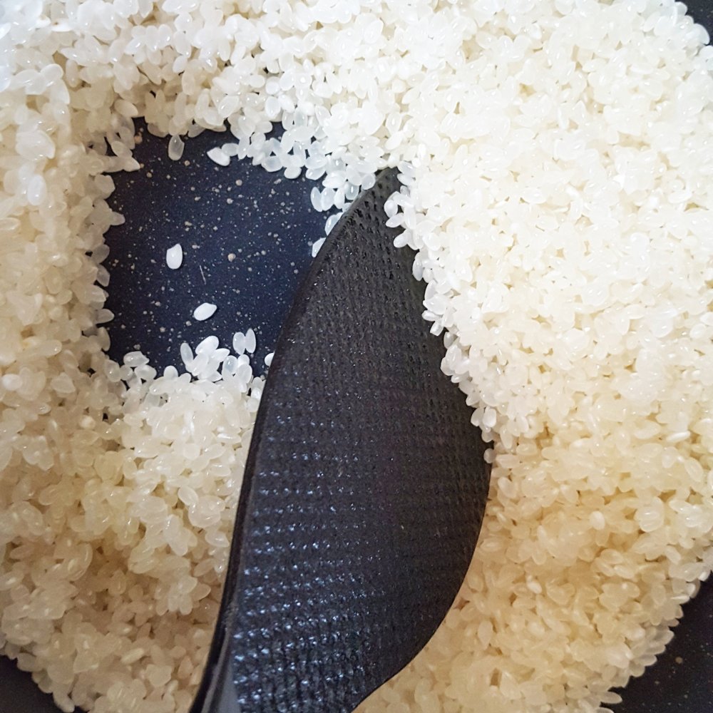 米を洗わないままごま油で透き通って来るまで炒めます。