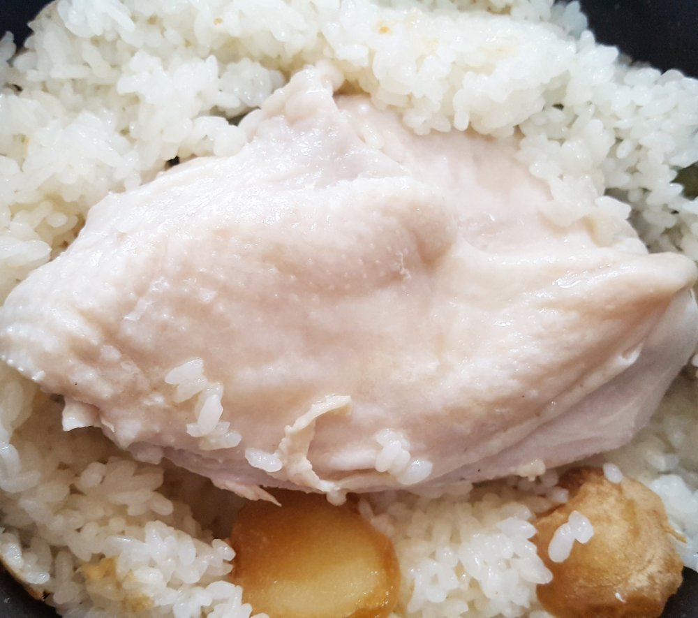 ■材料(2人分) 米……1カップ ごま油……大匙1 水……1.5カップ 鶏胸肉……1枚 生姜……1~2片 ねぎ(青い部分)……1本分 GABANガラムマサラ……小匙1