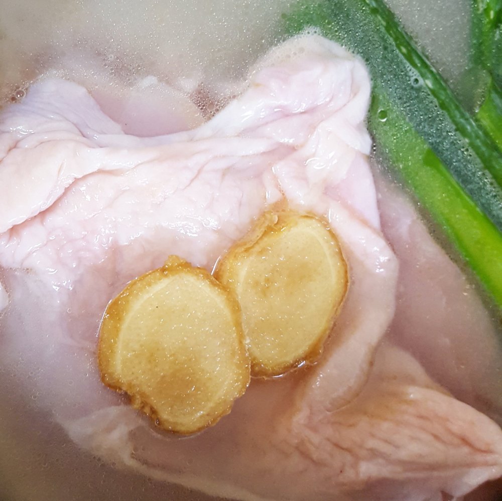 鍋に水を入れて、鶏肉、しょうが、ねぎを入れ、強火にかけます。