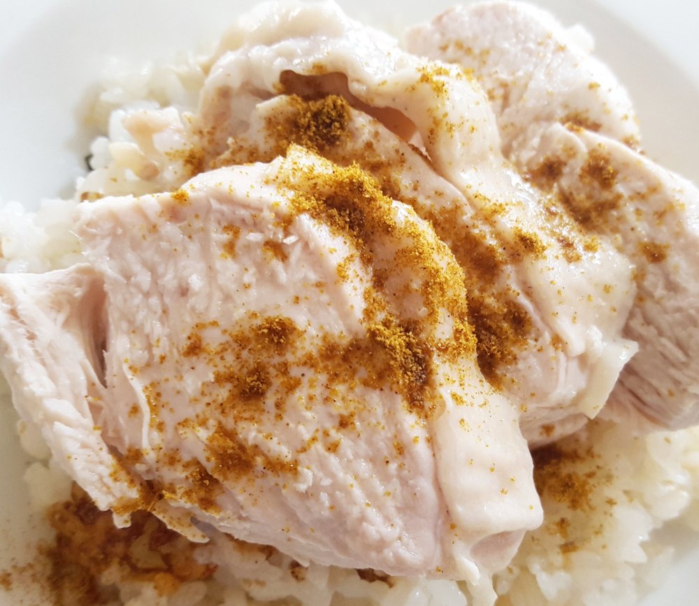 ご飯を皿に盛り付けたら、スライスした鶏肉を載せ、香りづけにガラムマサラを振りかけて完成です。