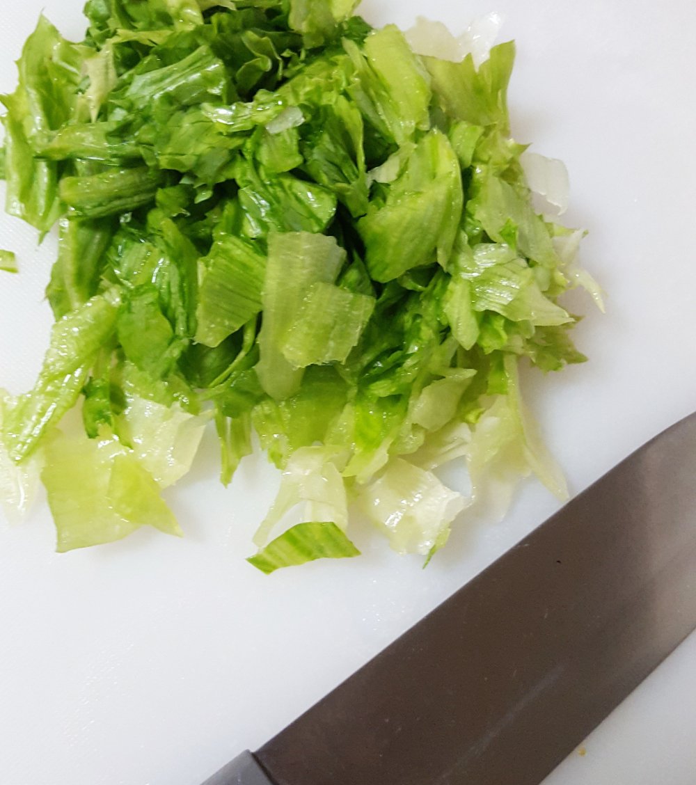 1. レタスはよく洗って水気を切り、ひと口大にカットする。