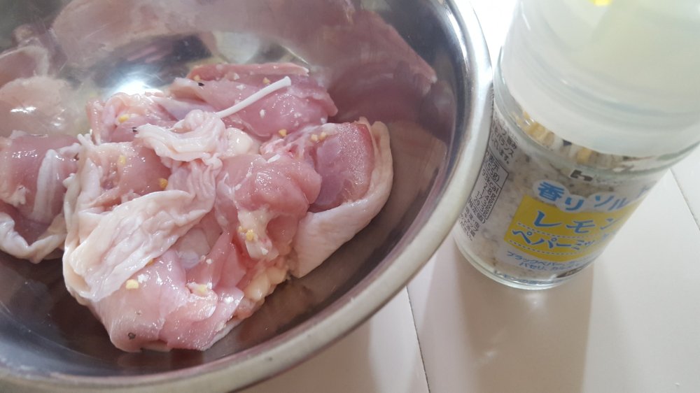 鶏モモ肉をひと口大に切り分け、香りソルトレモンペパーミックス、コショウ、酒をまぶしてもみ込み、冷蔵庫で30分置きます。