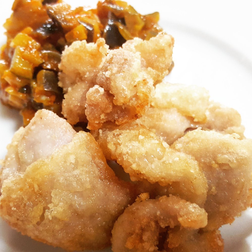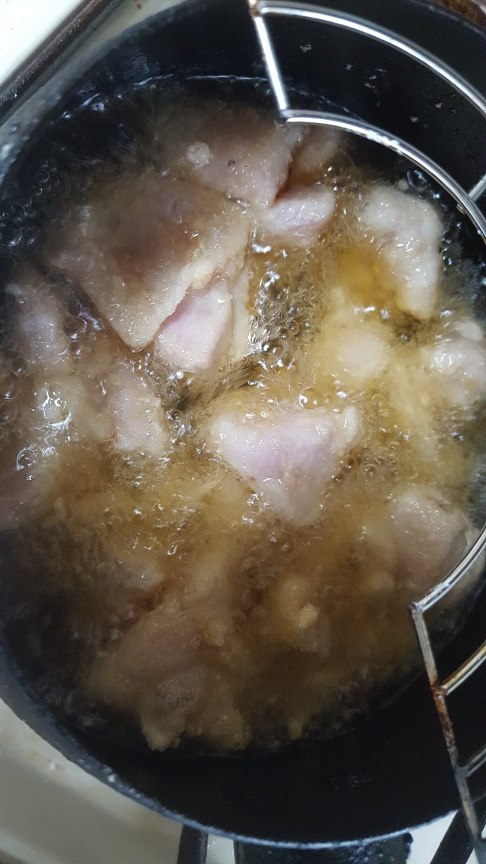 中温からやや高めの温度の油で、中に火が通るまで揚げます。