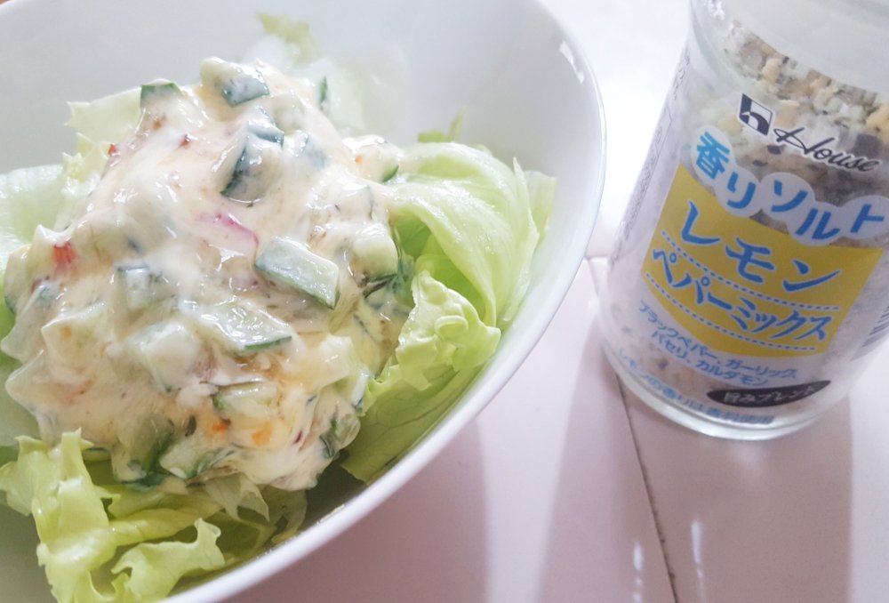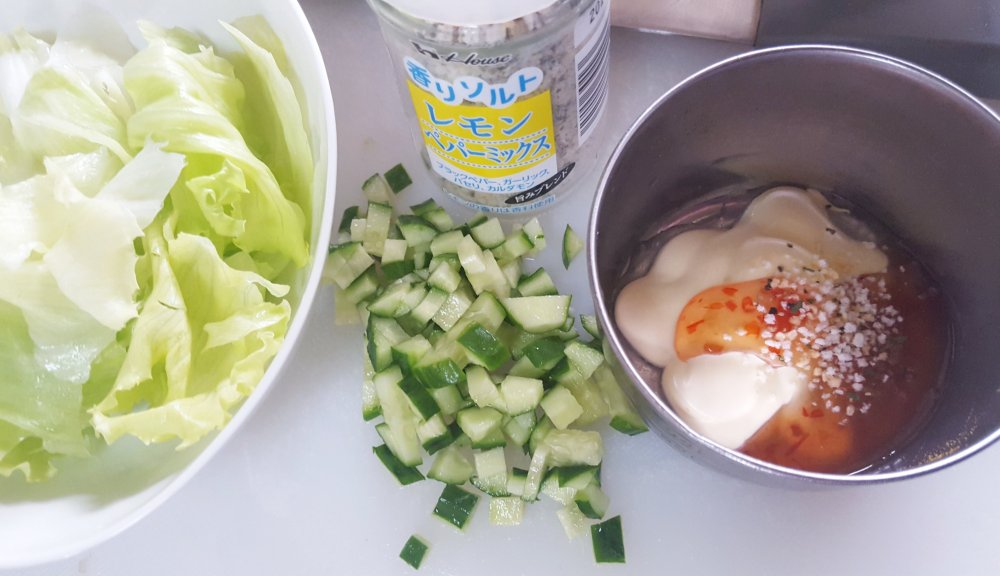 材料(1人分) レタス……2枚 キュウリ……1/2本 マヨネーズ……大匙1 スイートチリソース……大匙1 香りソルト レモンペパーミックス……小匙1