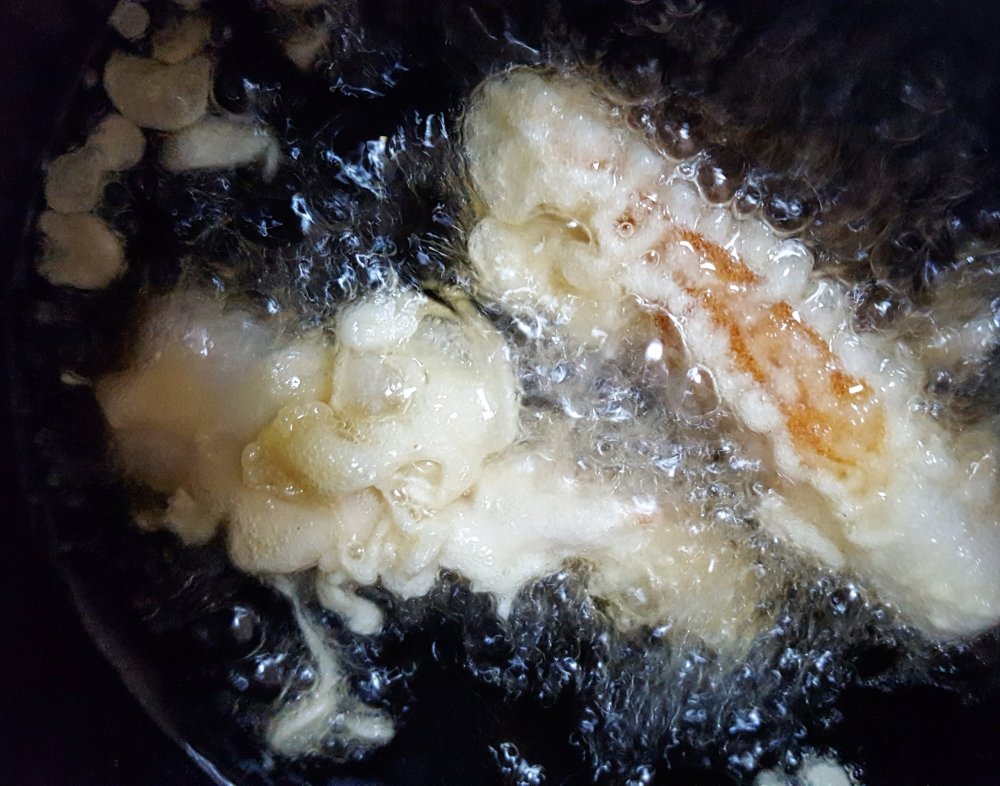 衣がかりっとしてちくわが膨らんで来たら揚げあがり。