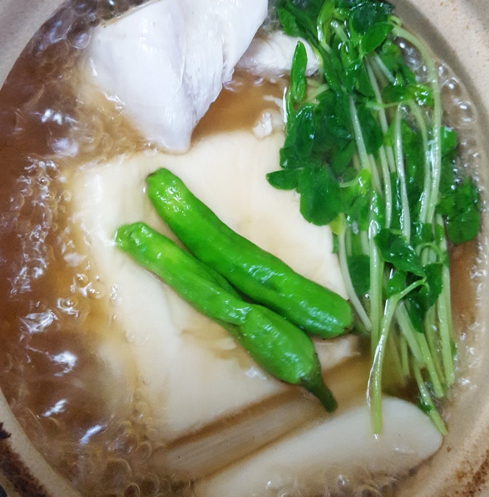 水切りした豆腐、食べやすい大きさに切ったねぎ、鶏肉、豆苗、ししとうを入れて火にかけ、沸いて来たら火を小さくして蓋をして三分ほど煮ます。