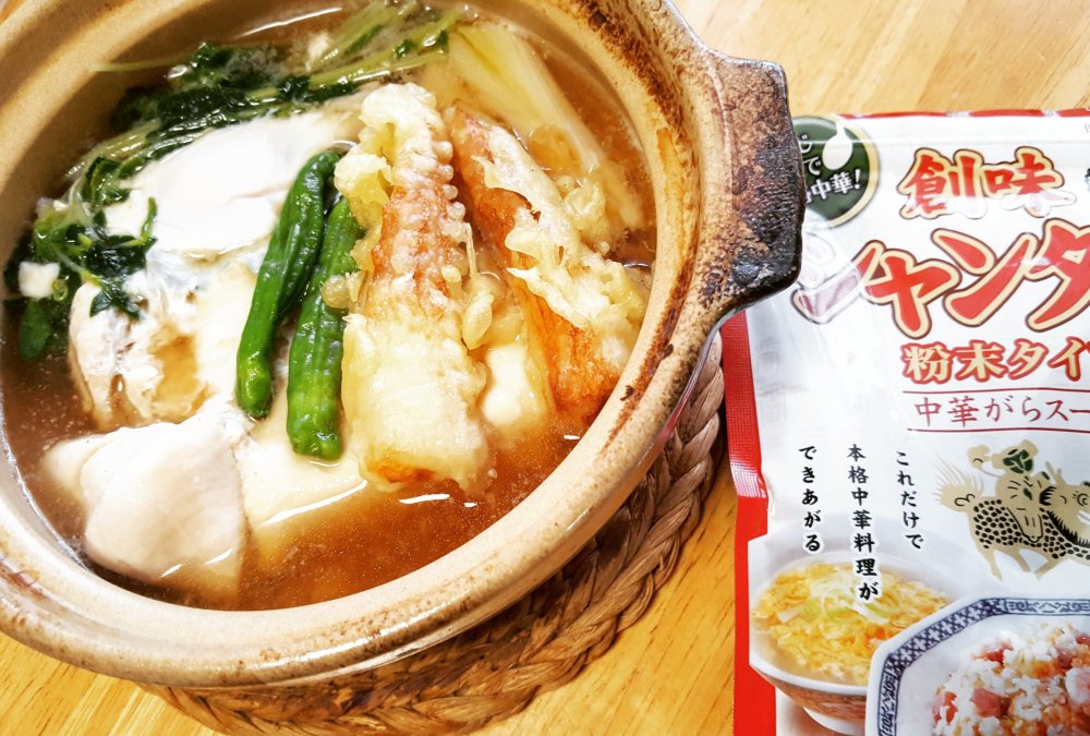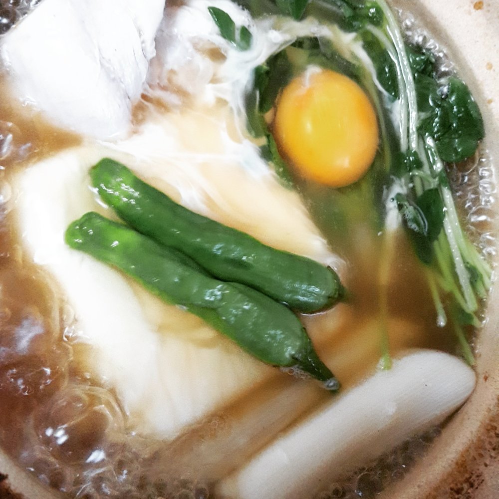 材料(1人分) 豆腐……1丁 鶏肉……2、3切 ねぎ……1/3本 豆苗……1/5パック ししとう……2本 創味シャンタン 粉末……大匙1 水……1カップ 醤油……大匙1 みりん……大匙1 【トッピング用】 ちくわ……1本 天ぷら粉……大匙2 水……大匙2 卵……1個 【シメ】 そうめん……1/2把 生姜……1/3個 乾燥ワカメ……1つまみ