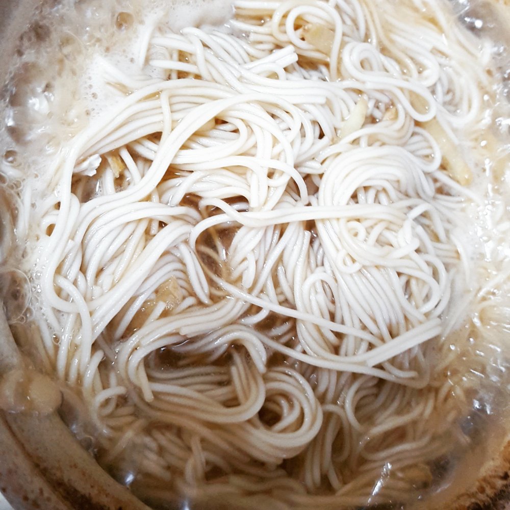 千切りにした生姜とそうめんを鍋の残り汁に入れて煮ます。