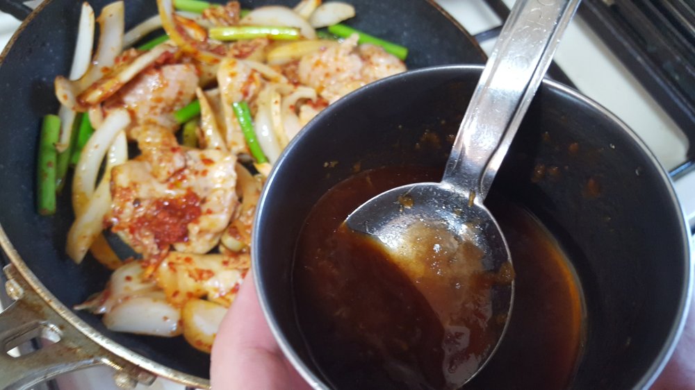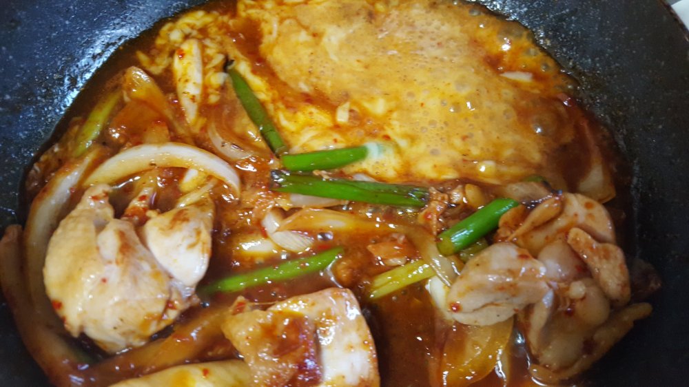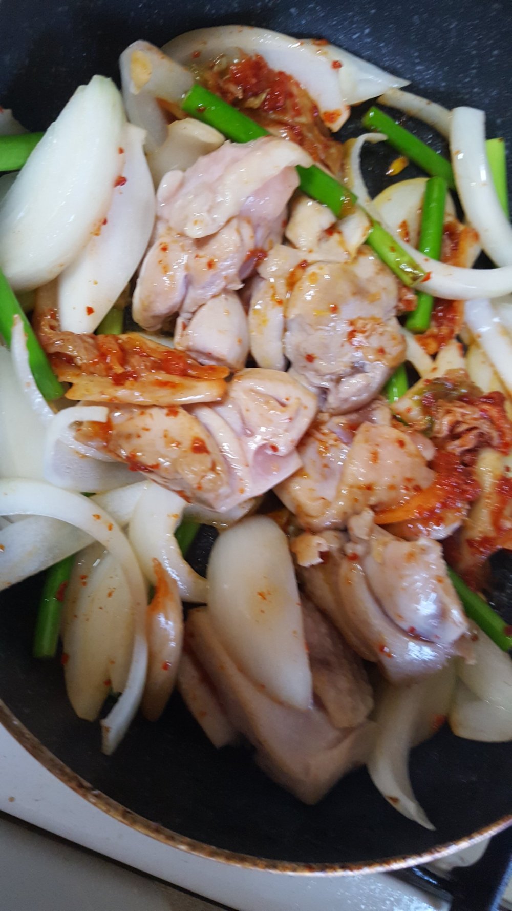 鶏肉、薄切りにした玉ねぎ、食べやすい大きさに切ったにんにくの芽、キムチを炒めます。