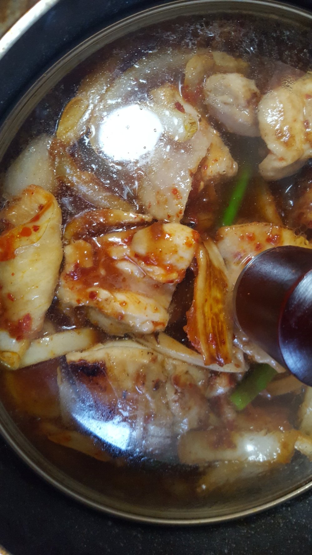 蓋をして鶏肉に八割程度火が通るまで蒸し焼きにします。