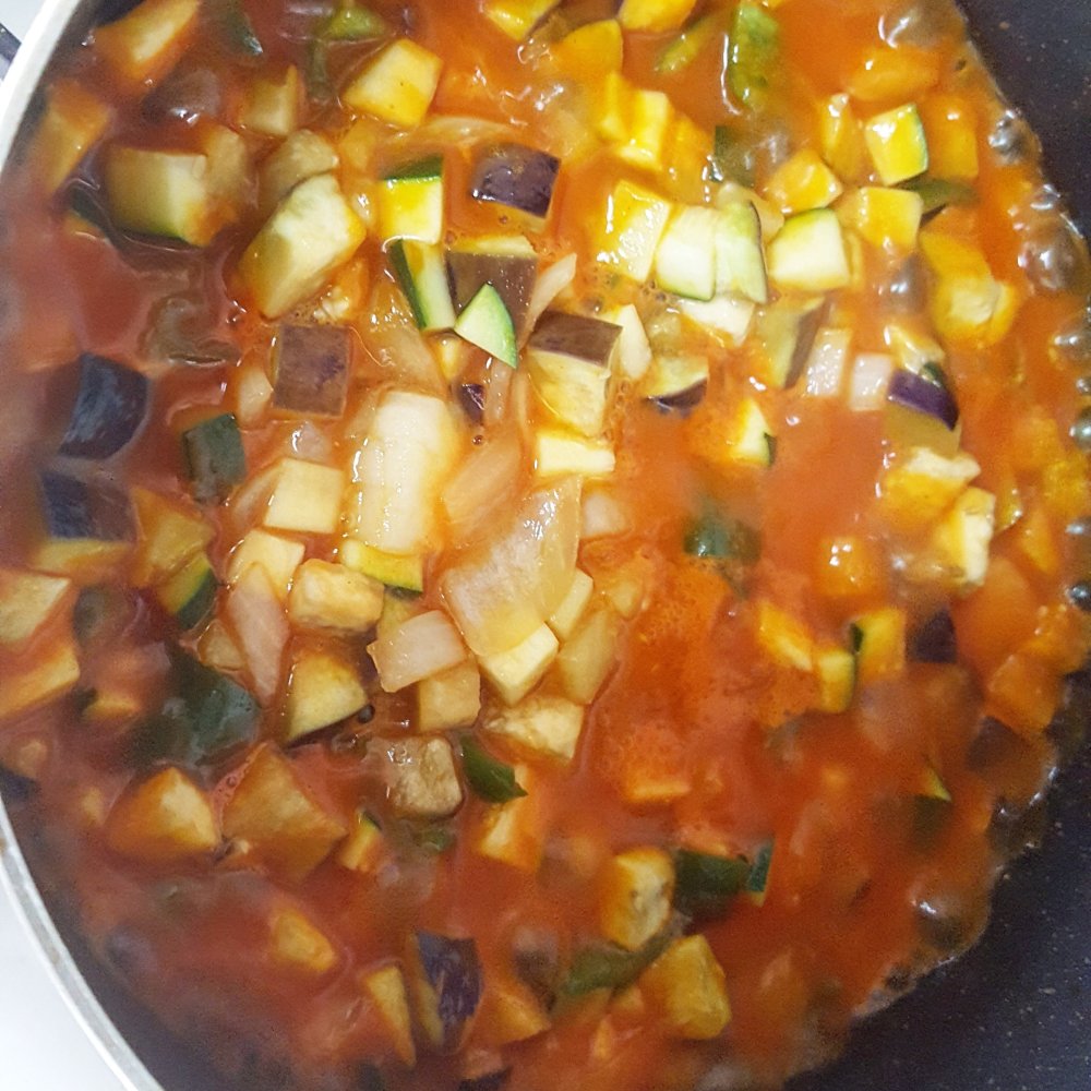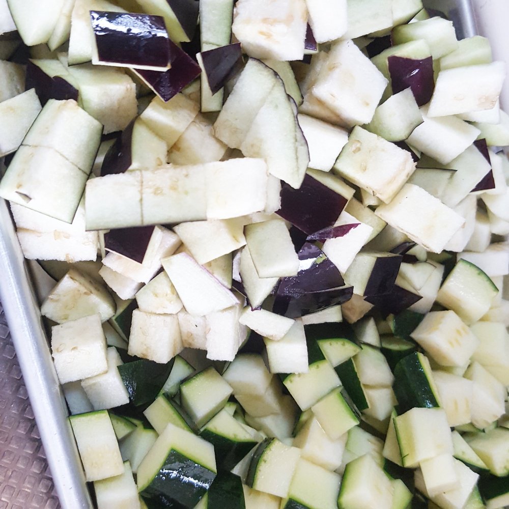 なす、ズッキーニも細かな角切りにして加えて炒めます。