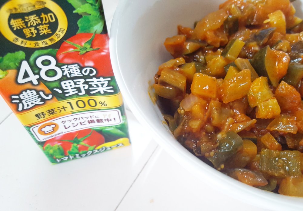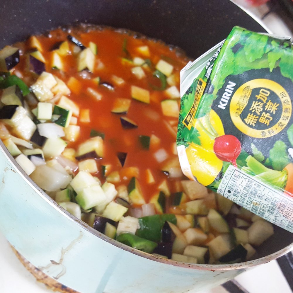 ■材料(2~3人分) なす……1本 ズッキーニ……1本 たまねぎ……1/2個 ピーマン……1個 おろしにんにく……小匙1 キリン 48種の濃い野菜200ml……1パック 塩コショウ……1つまみ