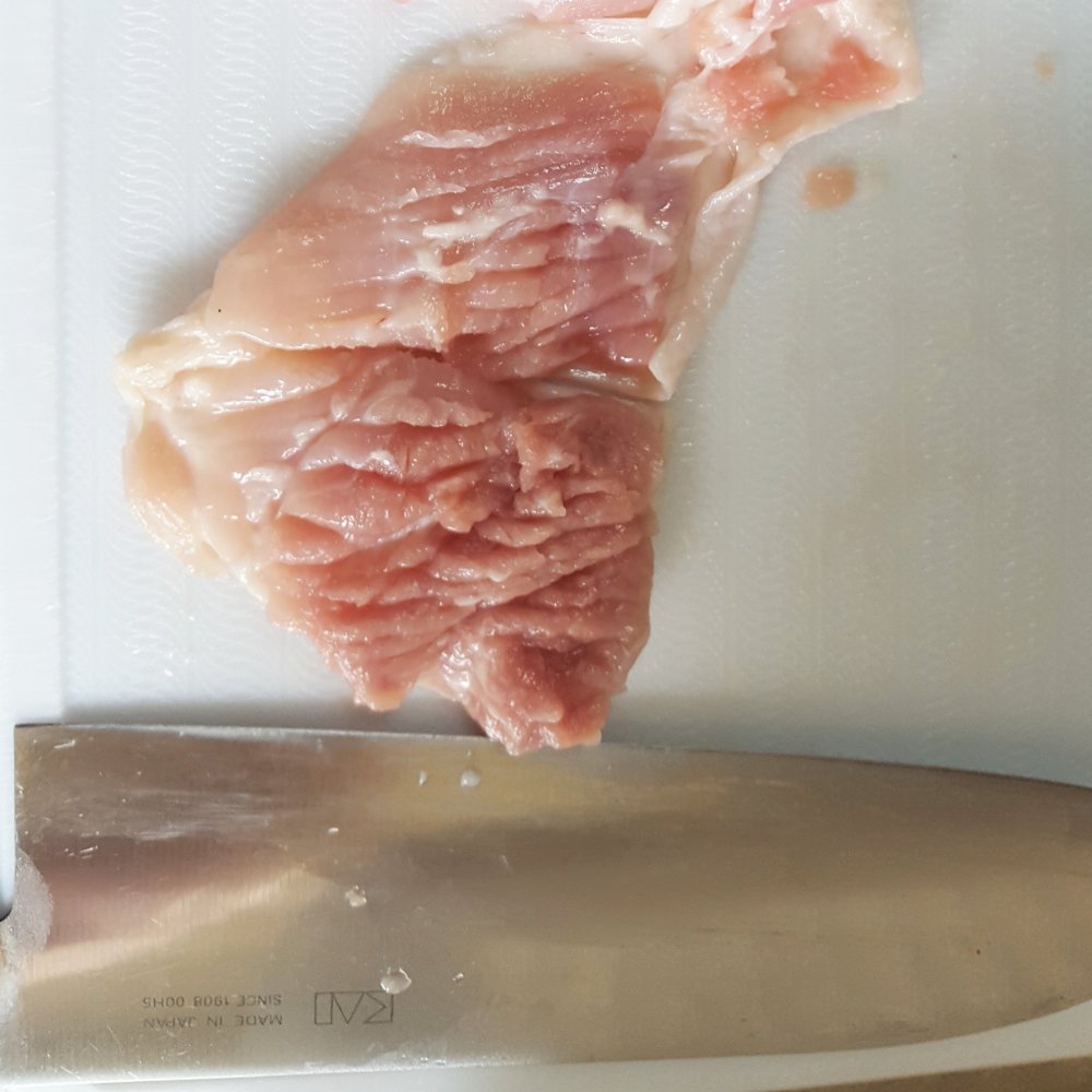 鶏肉は一口大にそぎ切りにして、繊維を切るように包丁の背でたたきます。