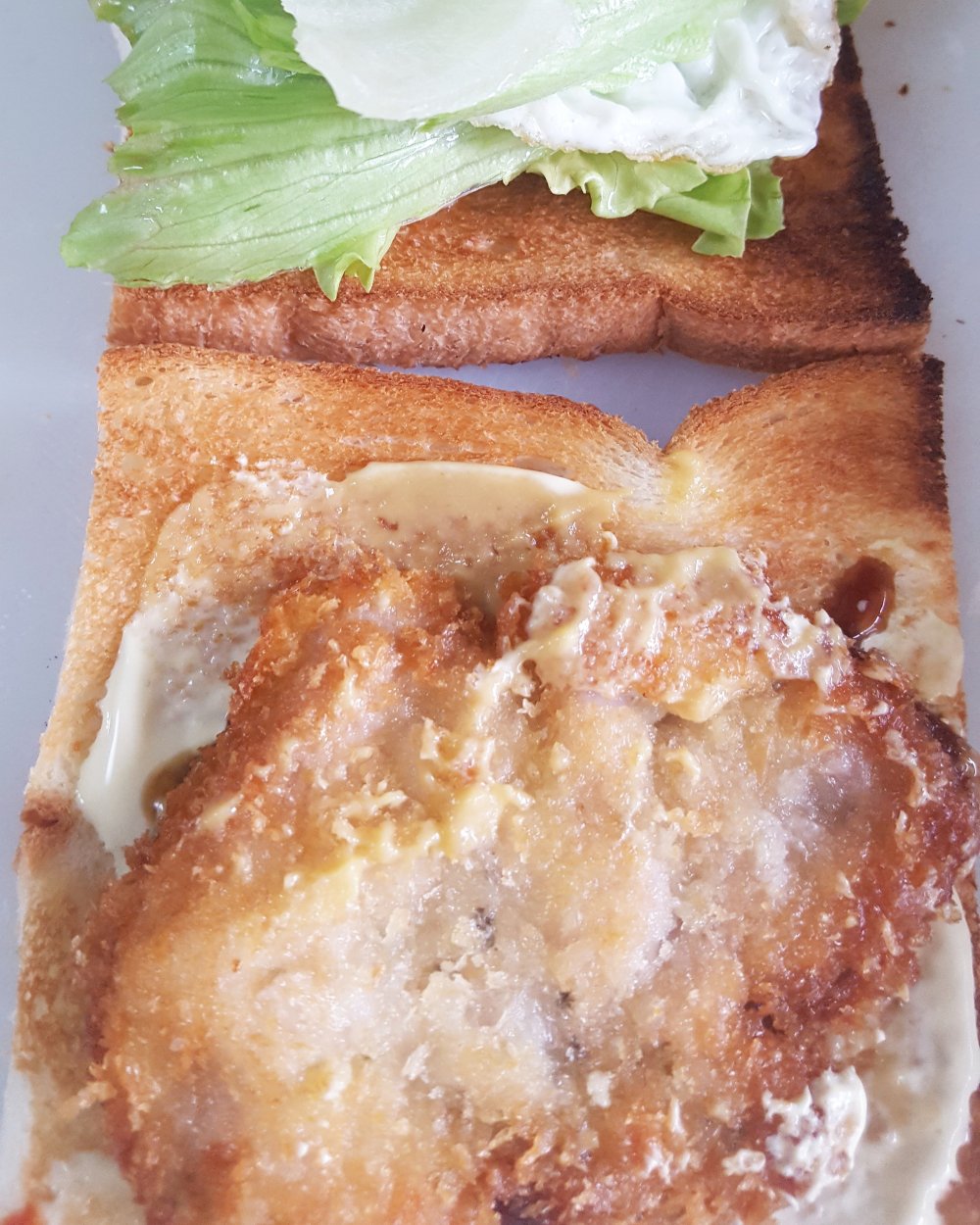 トーストしたパンにバター、からし、マヨネーズを塗り、レタスを敷き、カツをのせます。