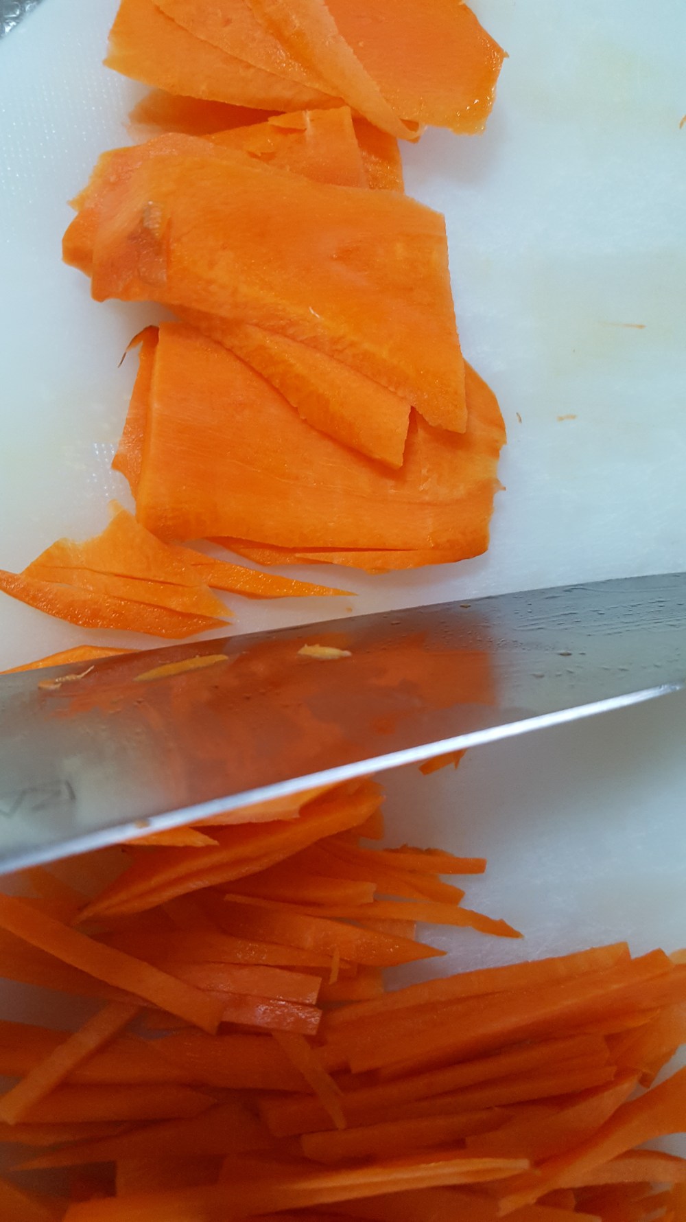 にんじんは半分に切ってから、スライスし、千切りにする。