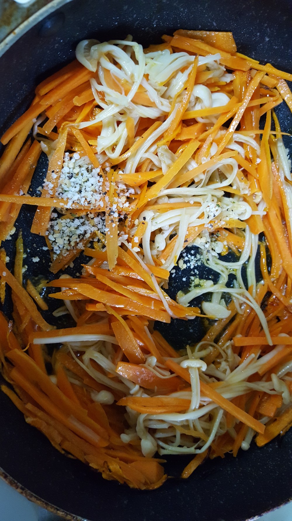 にんじんがしんなりしてきたら、えのきとねぎを加え、少し炒めてから香りソルトレモンペパーミックスを入れて全体をまぜて出来上がりです。