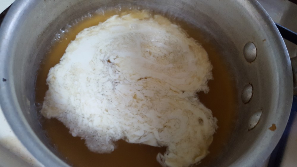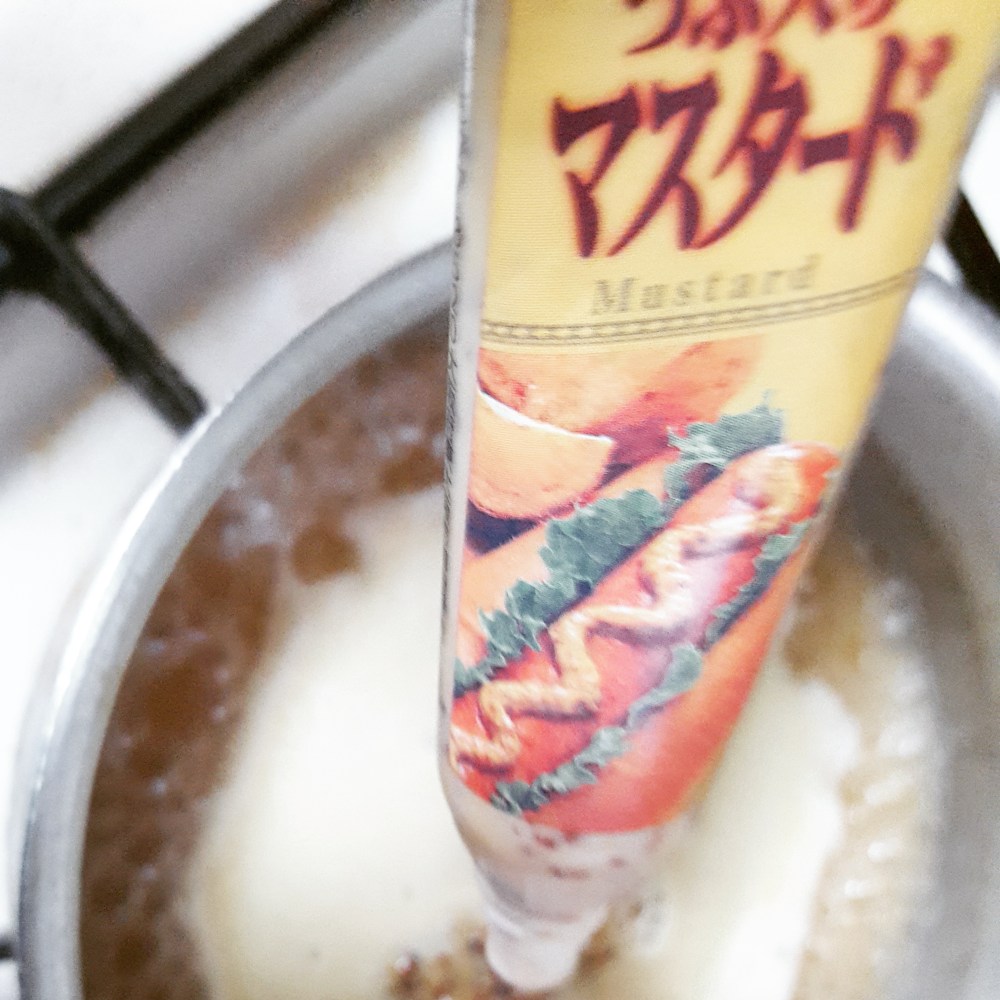 ハウスつぶ入りマスタードを入れて、ひと煮立ちさせたら火を止めてバターを溶かします。