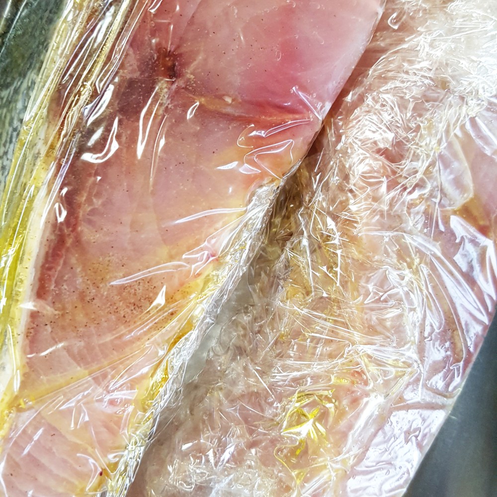 ブリは塩コショウして少しおき、水気をキッチンペーパーでよくふき取ったら、オリーブオイルをまぶしてラップで包み冷蔵庫で30分ほどマリネします。