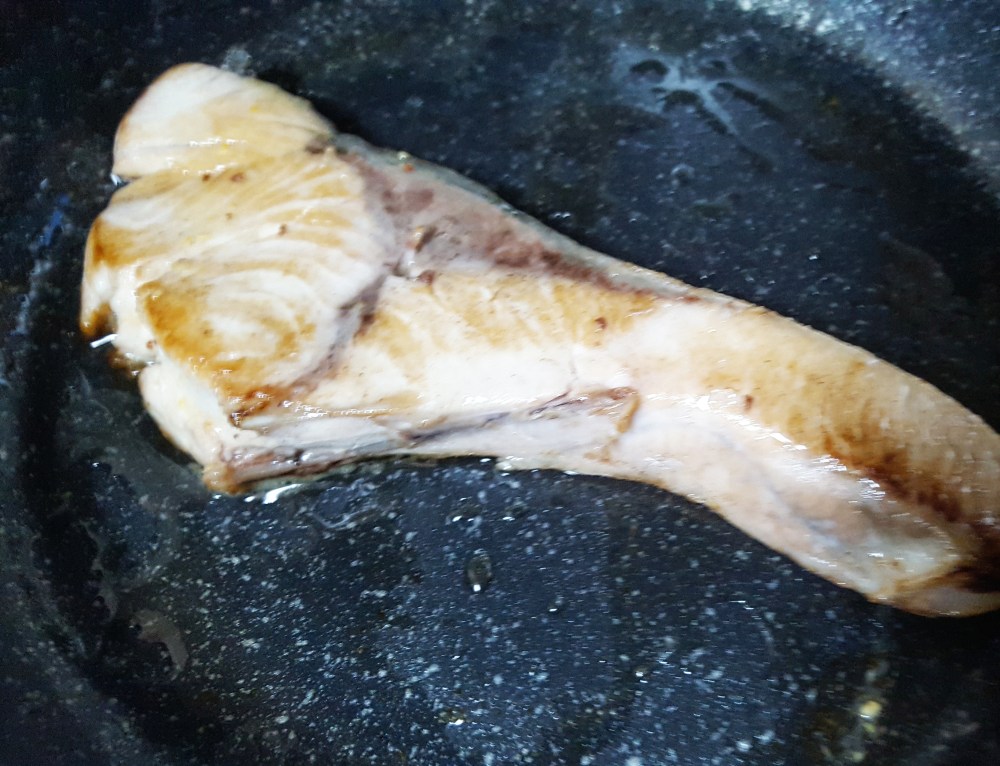 熱したフライパンにぶりを入れ、弱火でじっくりと両面焼きます。