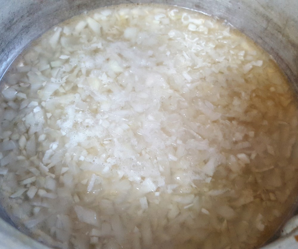 みじん切りにしたにんにく、玉ねぎ、白ワインを鍋に入れ、強火で水分がほぼなくなるまで煮詰めます。