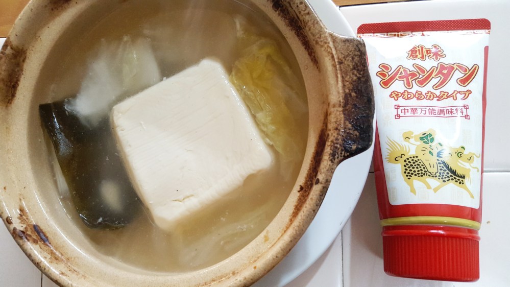 鍋に豆腐、創味シャンタンやわらかタイプ、白菜を入れて火にかけます。