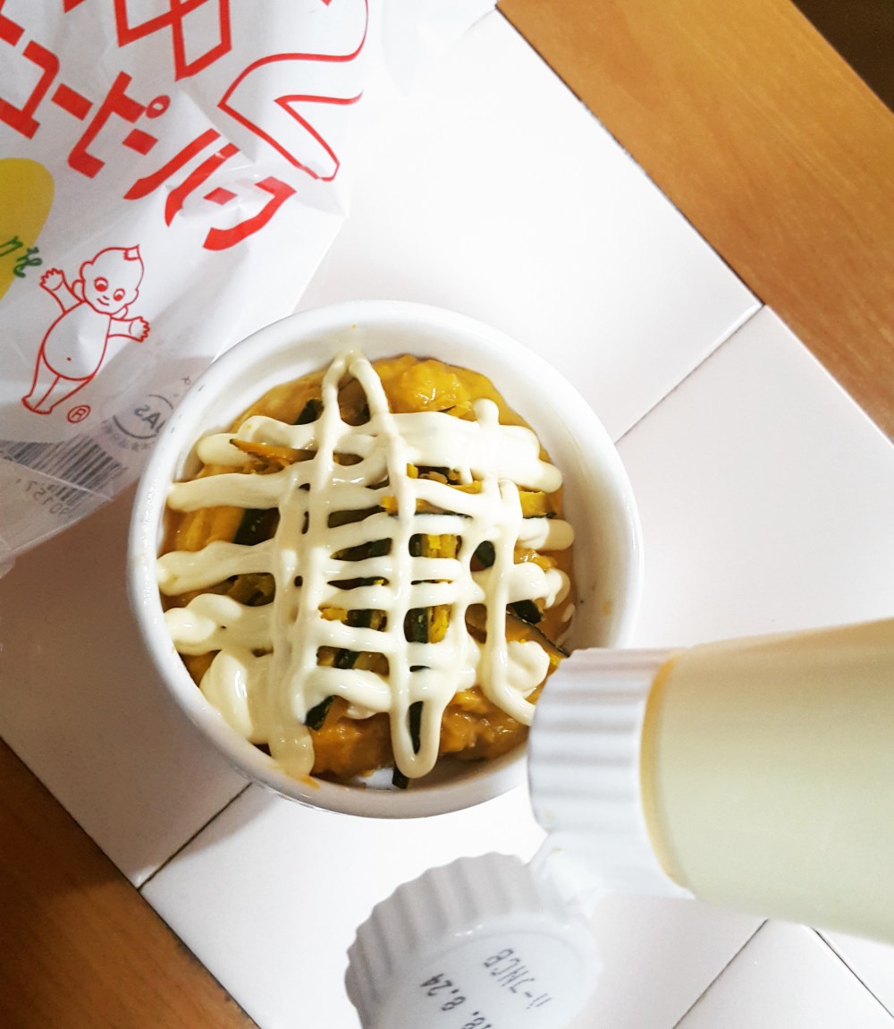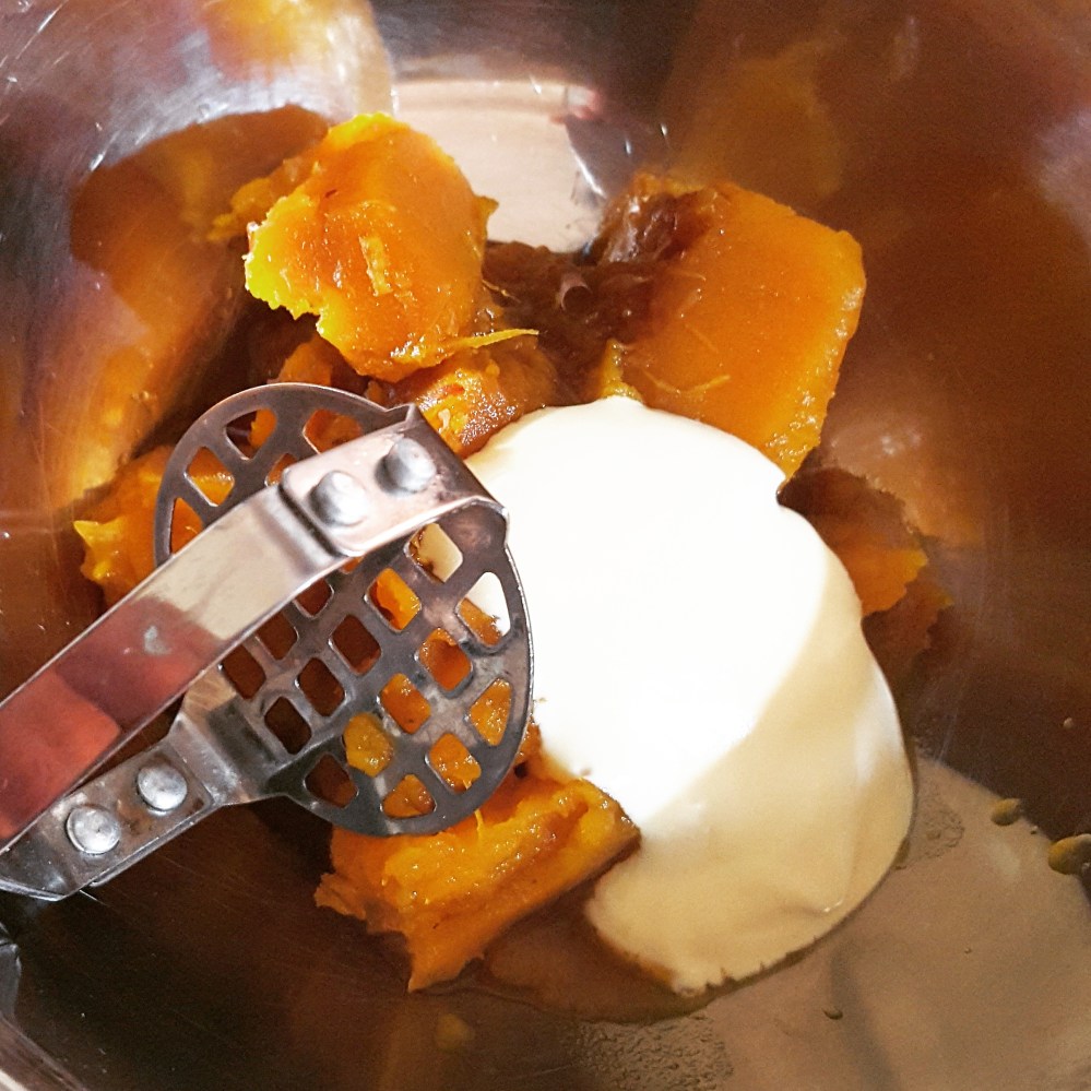 マヨネーズが多すぎると酸味が強くなるので、かぼちゃの煮汁を加えながら柔らかさを調整します。