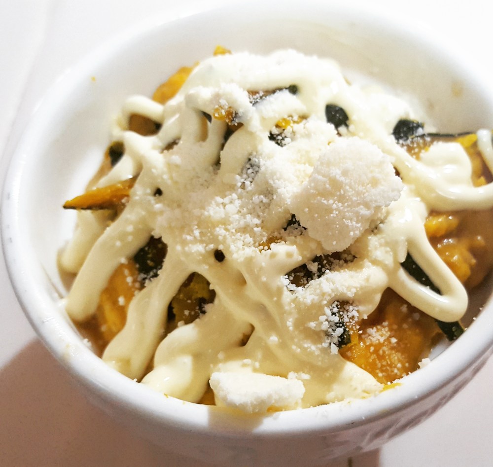 はずしておいた皮を刻んで、マッシュしたかぼちゃにトッピング⤴