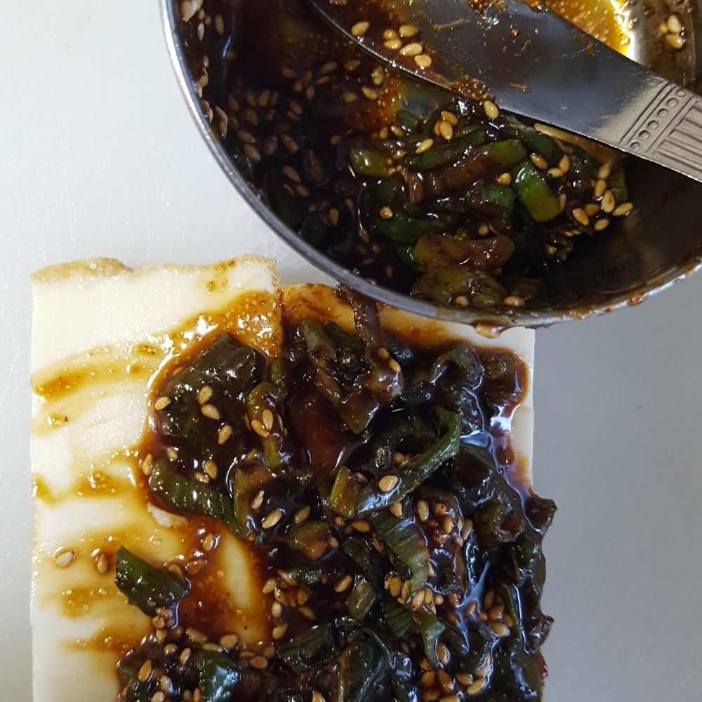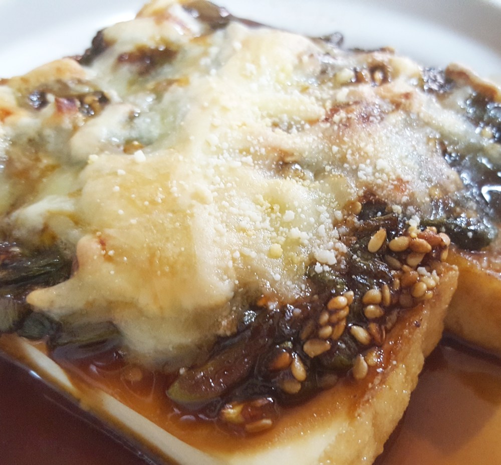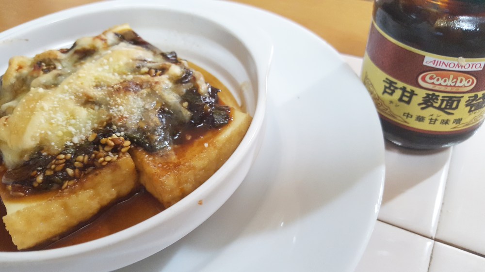 1cmくらいにスライスした厚揚げにまぜた甜面醤ソースをぬり、チーズをのせてオーブントースターで焼きます。