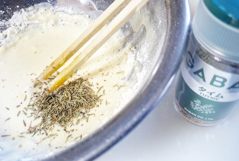 2. 天ぷら粉、ビール、タイム、塩コショウを混ぜて衣を作ります。