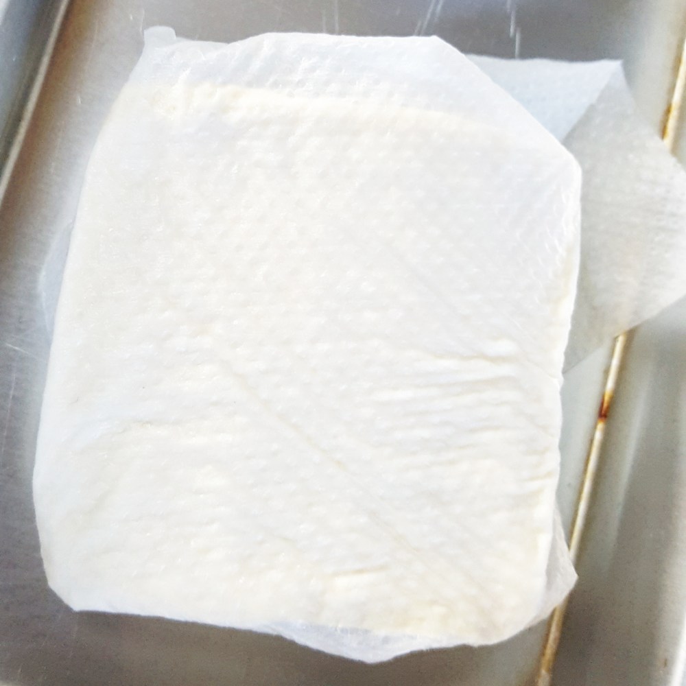 1. 豆腐はキッチンペーパーで包み、冷蔵庫で一晩おいて水を切ります。